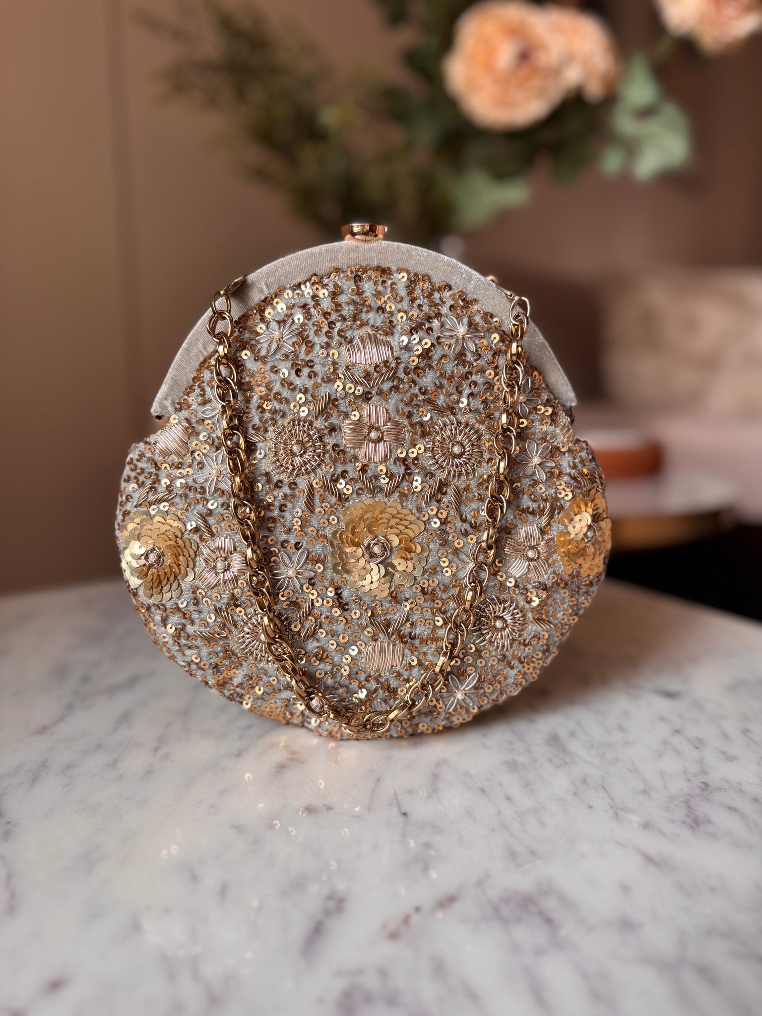 This is a vintage style soft clutch with a concealed metal frame on top and button clasp closure. Comes with a detachable short gold chain to sling on the arm.