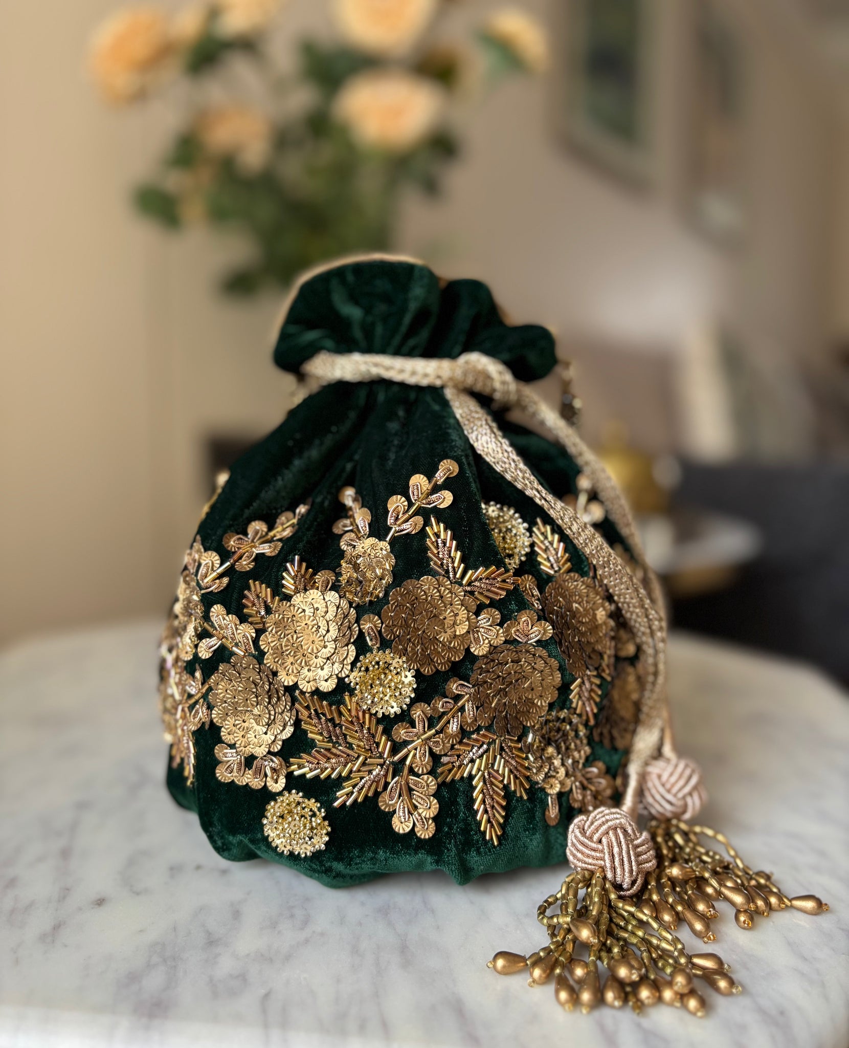 Hand Embroidery: Beautiful floral designs with sequins petals and cut daana leaves. Embellishments: Matching hand made tassel latkans and gold chain handle. Fabric: Velvet base & blended silk lining. Size: ~3 inch base radius; 9 inch height Care: Store in a muslin cloth.