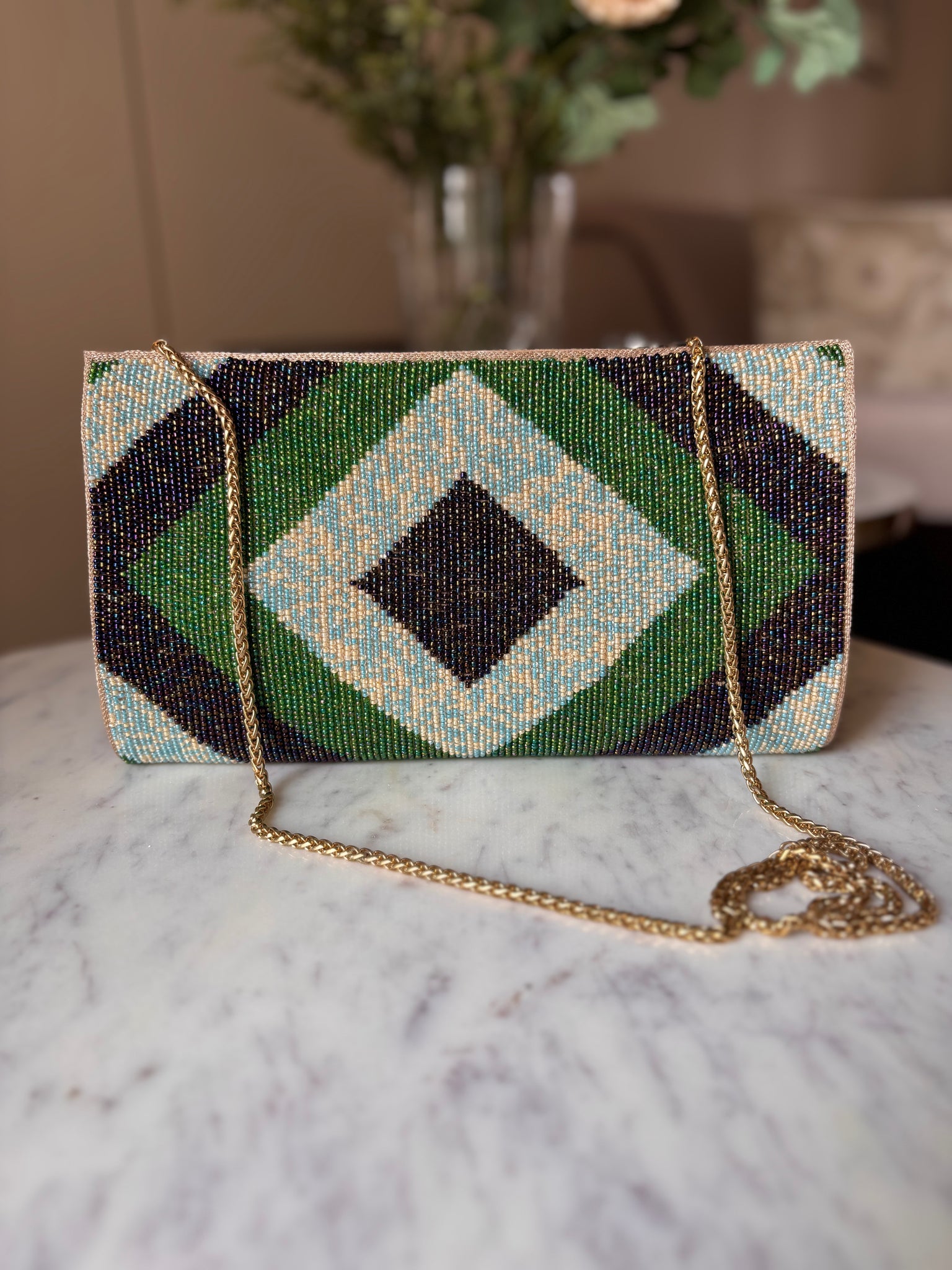 Hand embroidery: Bead work in beautiful shades of blue, green and yellow in a diamond pattern.