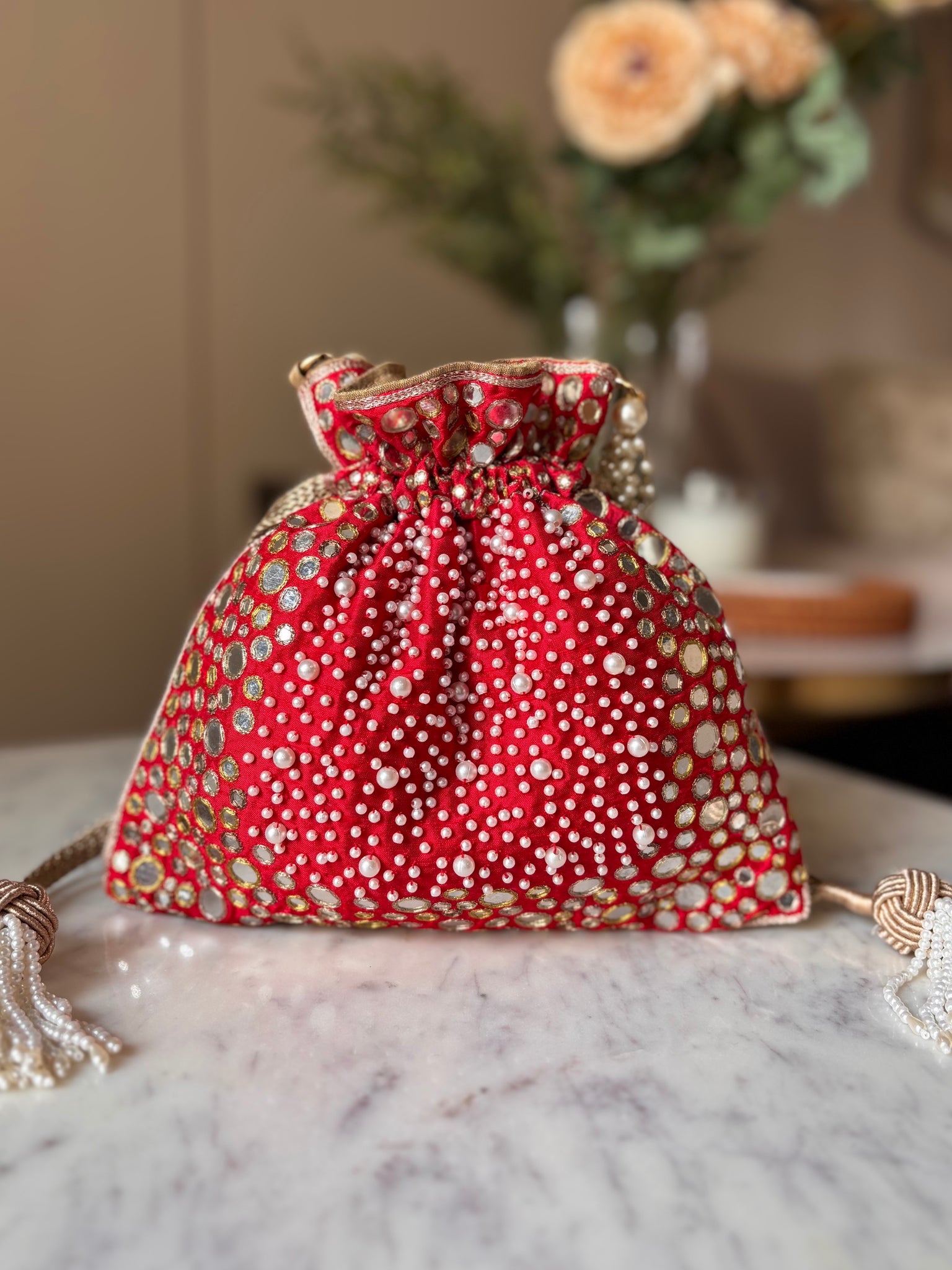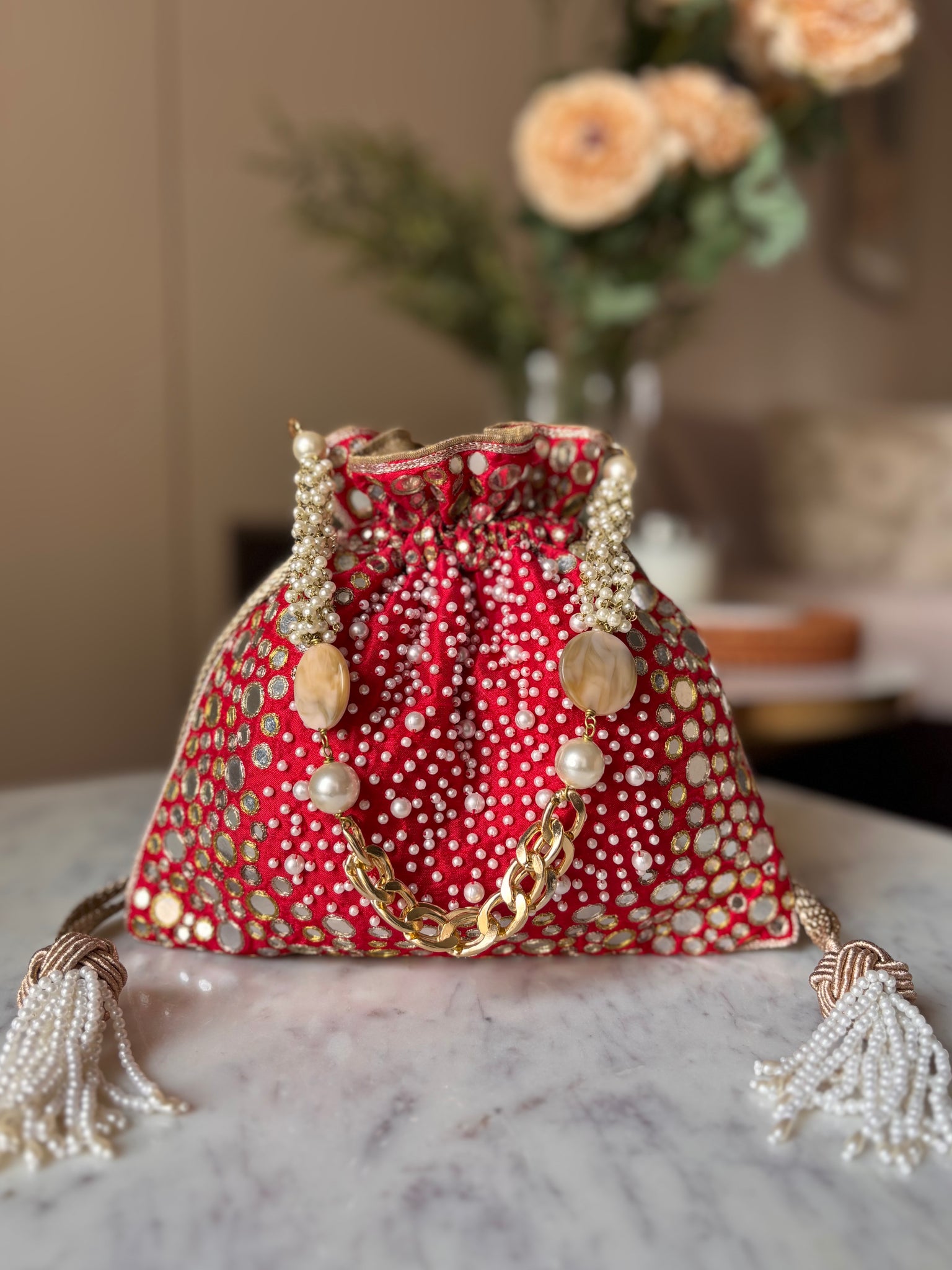 Hand Embroidery: Clustered aabla work on all sides outlined with gold zari & scattered pearl work in the centre. Embellishments: A pearl chain and matching hand made tassel latkans. Fabric: Raw silk base; Blended silk lining. Size: ~ 9 x 9 inches with 7 x 9 inch capacity. Care: Store in a muslin cloth.